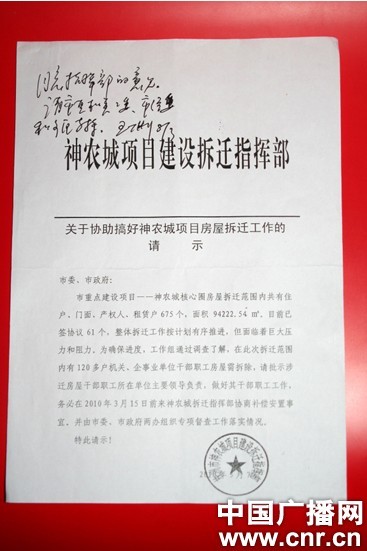最近,湖南株洲市民向《新闻纵横》反映,当地政府正在修建一座标志性建筑——炎帝广场神农城,而附近两个刚刚建成两年的住宅小区因此被迫拆迁。这些被拆迁的住户,有的刚装修完房子准备结婚,有的则不堪侵扰,有家不能回。 按照株洲政府网的介绍,神农城项目总占地面积2970亩,总投资超过100亿元,是株洲城市跨越式发展到一定阶段的节点之作,建成后将成为株洲的城市新名片和新客厅。可就是这个大客厅,却容不下老百姓的小客厅,公园大道A栋业主王升华说:本来我离婚了,我一个人带着3岁多的孩子,没有工作,用自己打工挣的钱买了这个50多平米的房子,我一个人外地人,在株洲,无亲无故的,房子这样强制性的抢夺,我拿了你这3100多块钱房屋评估的钱,我到河西、开元区任何一个地方,我买不到房,我买不起,我无能为力了。 王升华说,她买的是公园大道A栋期房,08年5月拿到钥匙,11月入住。让她没有想到的是,今年1月29日,株洲市人民政府颁布了拆迁通告,刚住了一年零两个月的房子就要被拆迁了。王升华咨询了多个楼盘后发现,随着近几年房价的飙升,拆迁补偿款在同等地段根本买不到房子,而置换房还没有开工建设,她将回到居无定所的生活。 另一名业主小吴的父母都是农民,而她自己的月收入1200多块钱。09年3月,父母以23万的价格买下一套65平米的二手房给她作嫁妆,为了这个新房,家里借了8万多块钱,还需要贷款按揭。因为是结婚用的,装修又花了不少钱,而拆迁评估的价格只有20万左右。 小吴:这个房子,是我妈妈出钱给我买的,我只是农民出身,这是我的嫁妆,但是现在我不晓得我这个婚还能不能结下去,我觉得我真的好无助的。 在公园大道A栋建设工程永久性责任标牌上,记者看到,这座楼的竣工日期是2008年1月。而此时,整栋建筑更像是一座烂尾楼,搬走住户的门窗已经被拆除,墙上到处是大大小小的洞,楼道内到处散落着垃圾、玻璃和鞭炮燃放后的纸屑,很多电表箱内的电线被切断后随意搭在墙上,一个3岁的孩子正蹲在没有扶手的楼梯上玩着一块带钉子的木板。 业主们告诉记者,拆迁公告发布以来,小区的治安环境和生存环境受到了严重的威胁,诸如半夜泼泔水、砸玻璃,堵锁眼,断水,断电,拆除楼梯扶手,半夜在楼道里放鞭炮等从来没有间断过。 正常的生活被拆迁打乱后,业主们曾多次到派出所、法院和有关主管部门反映问题,但从未得到过明确的答复。业主提供了一份去当地派出所报案的全程录音,办案民警说,这是株洲市的一号工程,是政府的行为,没办法解决。 办案民警:你找我们说有什么用,你们也清楚,我们也清楚,哪个来处理?处理的下来不?这是株洲市的一号工程,你没办法的,这是政府的行为,我们又受政府领导。 和这几位业主有着同样命运的除了公园大道A栋的140家住户外,还有城市星座B栋的95家住户。两个小区的业主们向记者出示了房屋所有权证和国有土地使用证,土地所有权期限为70年。业主们还向记者出示了对于拆迁的调查意见表,意见表上按着手印,几乎所有业主都不同意拆迁。但由于生存环境日趋恶劣,一部分住户无奈地签订了拆迁协议,还有一部分人是公职人员,他们说,签订拆迁协议是迫不得已。 业主:有单位的肯定先签啊,逼得你没有办法。 记者:他是有一个文件还是什么的? 业主:他们肯定是有文件的,我们看不到,上面压领导,领导就压我们。 记者:单位压领导,领导压你们。 业主:嗯,对对对。 记者:没办法的情况下就签了? 业主:嗯。 市长批示的房屋拆迁工作请示(摄影:中广网记者白宇) 目前两个小区还没有搬走的住户约有45家。业主们想不明白,为什么刚刚建成两年的房子说拆就要拆掉,有关部门做出的规划和拆迁决定是否合理、合法,他们向记者提供了神农城项目的有关文件。 在株洲市发改委《关于株洲神农城基础设施一期工程项目可行性研究报告的批复》中,记者看到,获得批复的项目名称是“株洲神农城基础设施一期工程项目”,批复的内容并不包括房屋拆迁。但在《建设用地规划许可证》和《拆迁许可证》上,项目名称则变为了神农城商务建筑圈。 株洲市委书记陈君文接受媒体采访时曾表示,神农城是一个“纯商业项目”, 根据我国《土地管理法》第五十四条的规定,此类用地应当以出让等有偿使用方式取得。但据该项目的《建设用地规划许可证》和《建设征(拨)用地审批单》显示,“神农城商务圈”项目的供地方式却是划拨土地。 据了解,湖南株洲与湖北随州、陕西宝鸡 、山西高平等4省五地都自称为“炎帝故里”,有媒体报道称,株洲的炎帝故里项目—— “神农城项目”是名人故里之争中投资规模最大的项目。那么,为了这样一个名人故里项目,就把建成刚两年的住宅小区拆迁,是否应该?项目审批过程是否存在违法违规行为,中国之声将持续关注。中广网株洲6月14日消息(记者邓文辉 白宇 实习记者张若紫) 本站编辑:商海浪子 , 【免责声明】本文仅代表作者本人观点,与本站无关。手靠手写字楼信息网对文中陈述、观点判断保持中立,不对所包含内容的准确性、可靠性或完整性提供任何明示或暗示的保证。请读者仅作参考,并请自行承担全部责任。